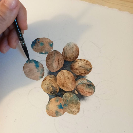 Et voilà... Une petite noix au brouillon pour commencer, histoire de voir si ça tenait la route, puis zou, dessin préparatoire et mise en couleurs. Bilan de l'aventure, et bien c'était génial de voir les noix prendre forme les unes après les autres ! Par moments je les peignais une par une, par moments deux ou trois par trois. À la fin j'ai eu envie de casser un peu (non, pas des noix !) le côté trop sec du rendu, d'où le contour flouté. Retrouvez l'aquarelle terminée dans l'onglet "Aquarelles" .